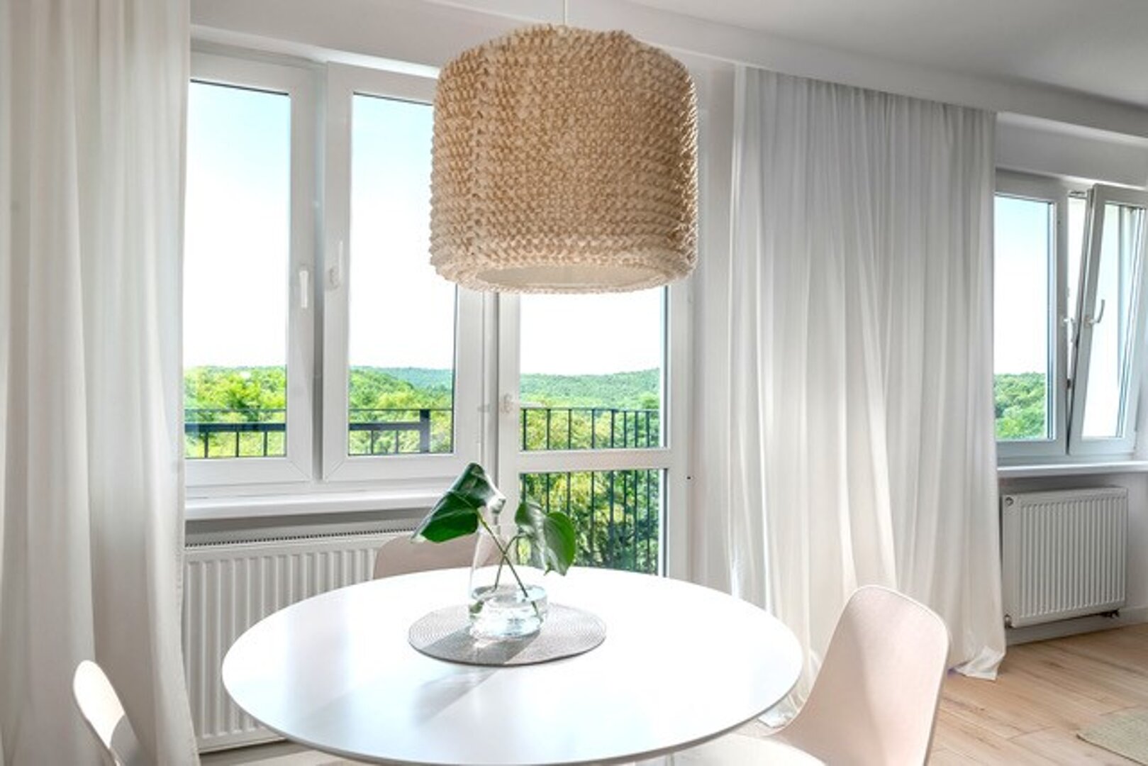 Welcome to an elegant, light-filled apartment located on a high floor in Sopot, offering a calming panoramic view over lush greenery.